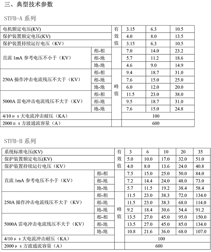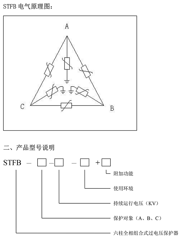 常规四星型过电压保护器,相单元持续运行下荷电率偏高,易加速老化降低使用寿命;地单元在出现单相接地时通流容量不足容易热崩溃。STFB六柱全相保护装置,使用了三角形接法进行相间保护,使用了星型接法进行对地保护,6个单元各司其职,互不干扰,不再导致常规四星型过电压保护器的上述问题,提高了相间保护,对地保护的可靠性。同时具有电机匝间保护能力,并通过特殊装配结构,必要时引出第七极对特种电容器极间进行加强保护。